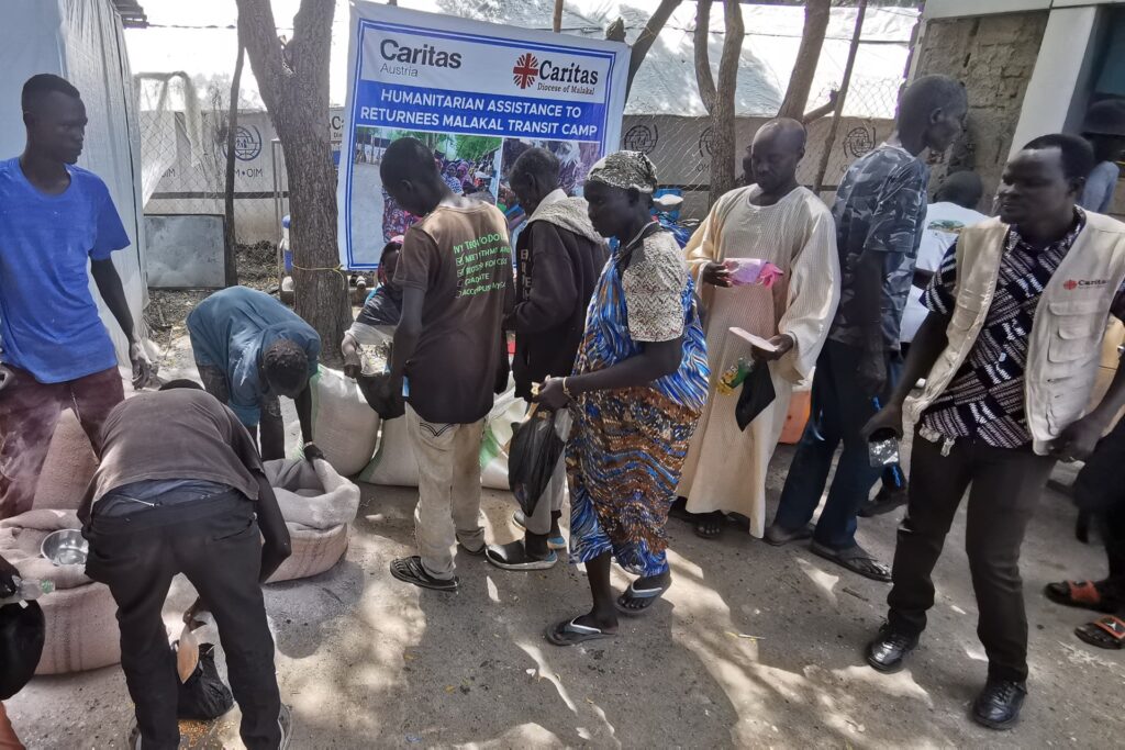 La delegazione di Caritas Italiana in visita ieri al campo temporaneo dei profughi sudanesi a Malakal. Qui i profughi arrivano tramite battello sul Nilo dal Sudan e si fermano in attesa di essere trasferiti in altre località. Nel campo arrivano circa mille persone a settimana. La Caritas fornisce giornalmente cibo a coloro che ancora non sono registrati per riceverlo dal WFP, il Programma dell’ONU per l’assistenza alimentare. Distribuisce farina, olio, sale e legumi.