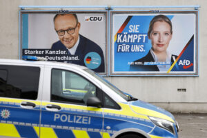 Election posters for the Bundestag elections in Cologne +++ Ein Wahlplakat der AfD mit dem Konterfei von Spitzenkandidatin Alice Weidel haengt neben einem Wahlplakat der CDU mit dem Konterfei von Spitzenkandidat Friedrich Merz vor einer Polizeiwache in Koeln. Die CDU hat ihre Waehler eingeschworen, gegenueber der AfD eine Politik der Brandmauer aufrecht halten zu wollen. (Themenbild, Symbolbild) Koeln, 19.02.2025No Use Sweden. No Use Germany.