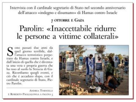 CITTA’ DEL VATICANO, 07 OTT – L’ampia intervista del cardinale Pietro Parolin ai media vaticani nel secondo anniversario del 7 ottobre era parsa ai più un bell’esempio sia di equilibrio diplomatico, com’è nello stile del segretario di Stato vaticano, sia di sincera partecipazione umana alle immani sofferenze inflitte a entrambi le parti dalla guerra tra Israele e Hamas. “Inaccettabile ridurre le persone a vittime collaterali”, è il titolo che ha accompagnato le considerazioni del primo collaboratore di Leone XIV, in cui non mancava certo la vicinanza alle vittime israeliane del ‘pogrom’ di Hamas, agli ostaggi di cui la Santa Sede ha sempre fatto appello al rilascio, e non mancava neanche la condanna dell’antisemitismo, “cancro da combattere e da estirpare”.